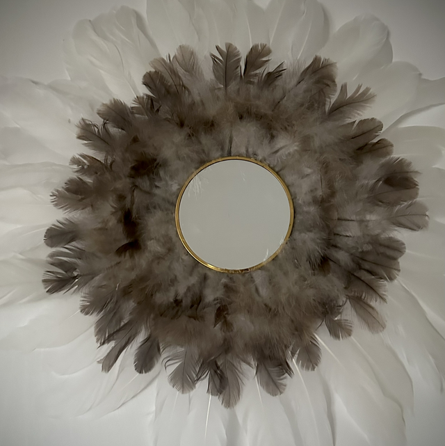 Ce miroir est fait avec les petites plumes marrons de mes deux poules: y’a pas plus local!